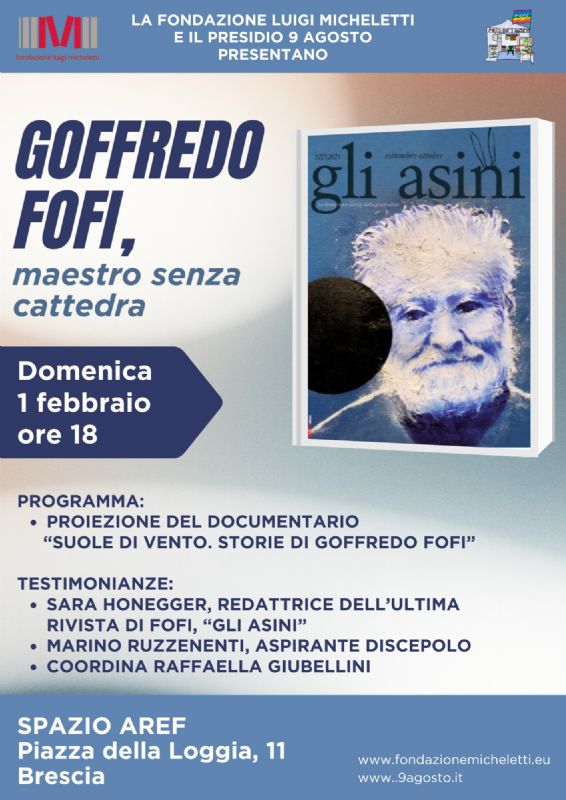 [...]"Goffredo Fofi, maestro senza cattedra" è il titolo dell'iniziativa promossa dalla Fondazione Luigi Micheletti e dal Presidio 9 Agosto, in programma domenica 1 febbraio alle ore 18:00 presso Spazio Aref (Piazza della Loggia n.11 a Brescia).