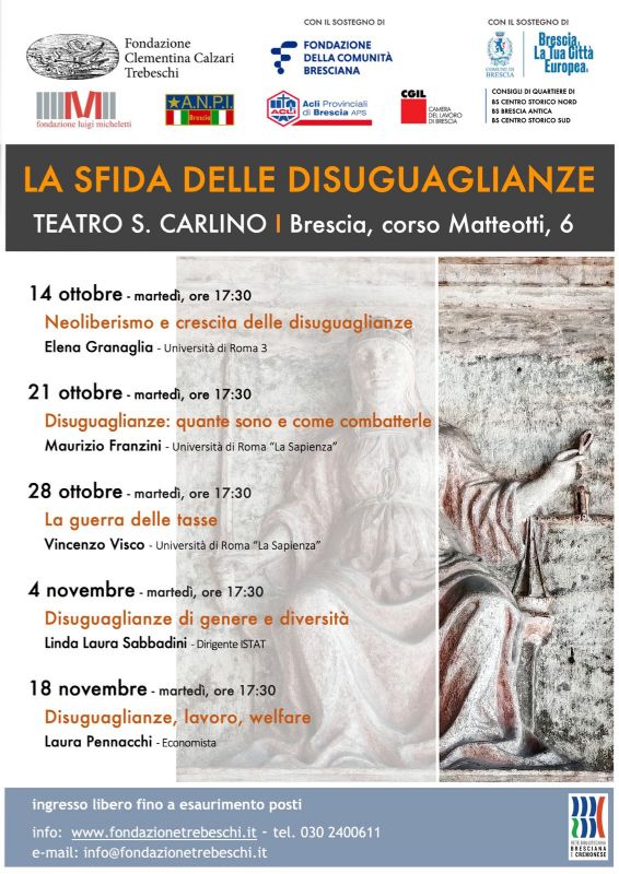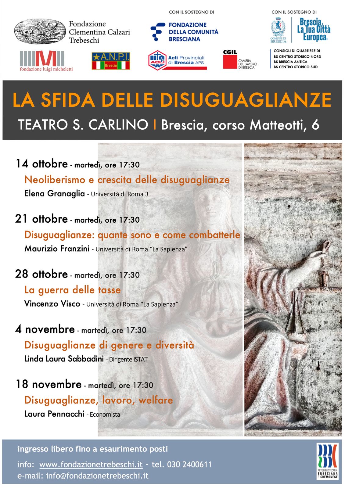 Al Teatro S. Carlino (in Corso Matteotti n.6 a Brescia) si svolgerà un ciclo di appuntamenti pubblici dedicati al tema delle disuguaglianze. Gli incontri si terranno il martedì alle ore 17:30 con ingresso libero fino a esaurimento posti.