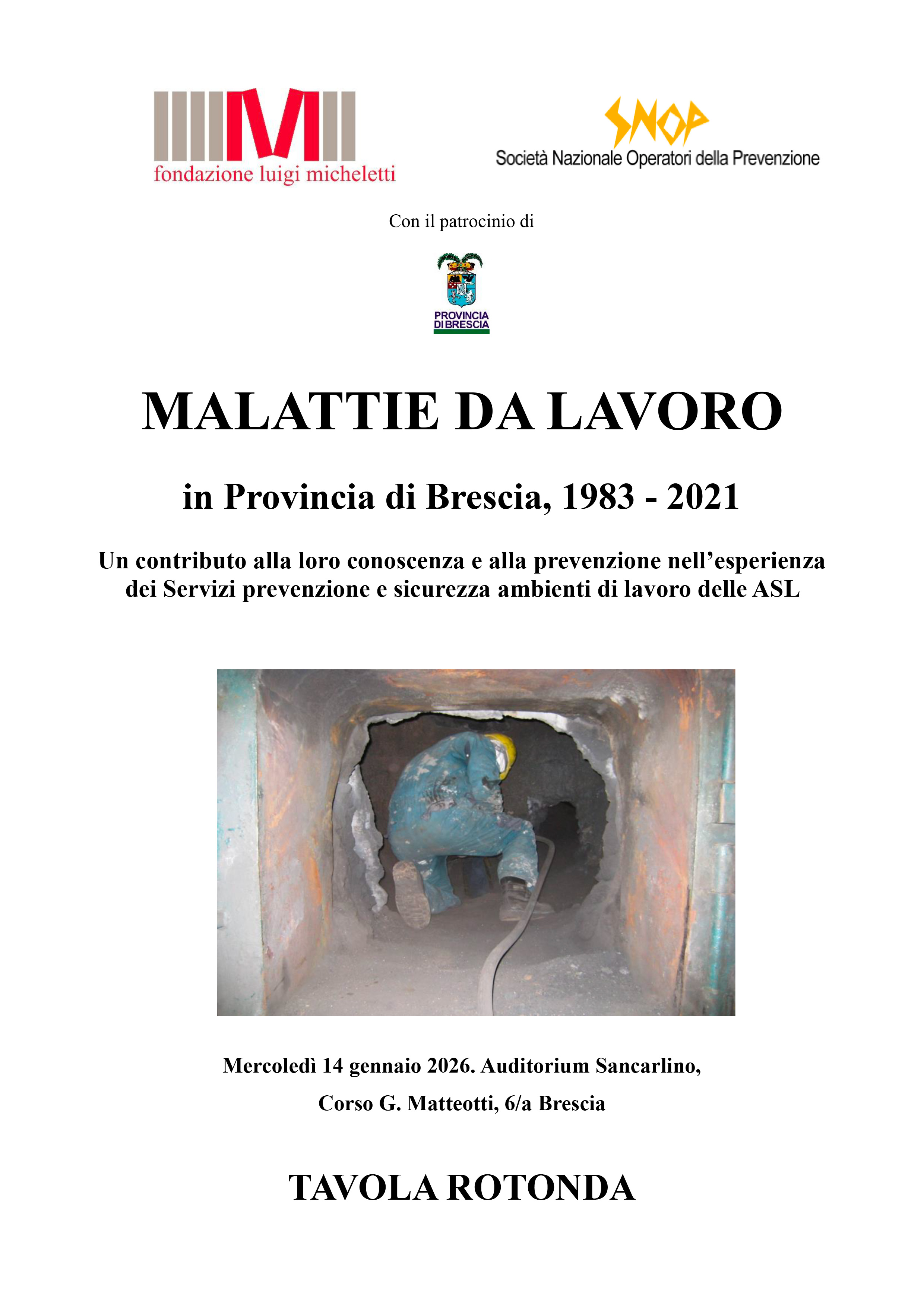 Mercoledì 14 gennaio 2026, presso l'Auditorium Sancarlino di Brescia (Corso G. Matteotti, 6/a), si terrà una tavola rotonda dal titolo "Malattie da lavoro in Provincia di Brescia, 1983-2021. Un contributo alla loro conoscenza e alla prevenzione nell'esperienza dei Servizi prevenzione e sicurezza ambienti di lavoro delle ASL".