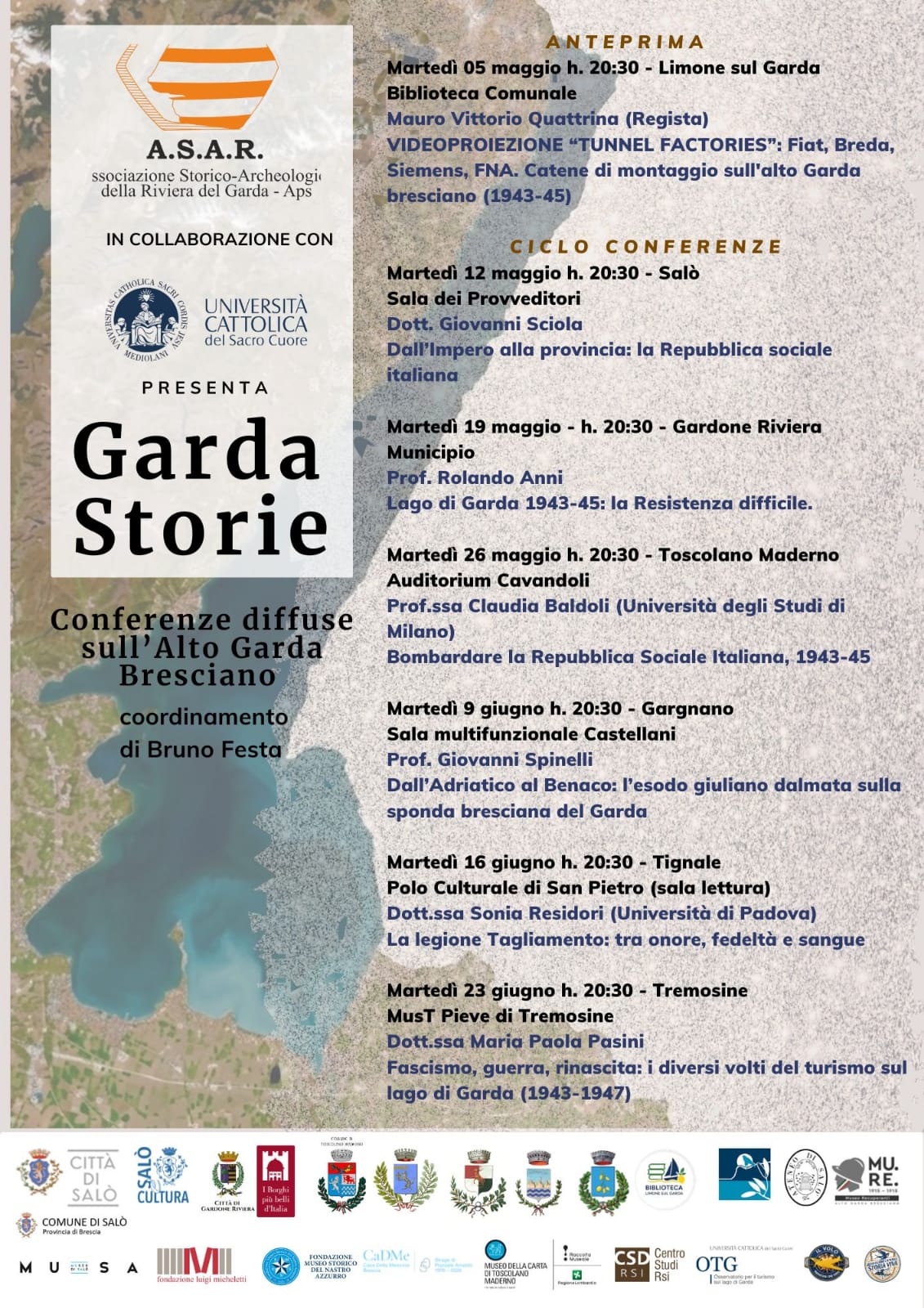 Il progetto, coordinato da Bruno Festa, propone una serie di appuntamenti itineranti tra maggio e giugno, con il coinvolgimento di studiosi e ricercatori impegnati nell’approfondimento di temi legati alla storia del Garda nel periodo della Seconda guerra mondiale e del primo dopoguerra.